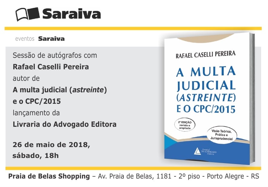 Acontece, no próximo dia 26, o lançamento da 2ª edição do livro "A Multa Judicial (Astreinte) e o CPC/2015" (Livraria do Advogado Editora), de Rafael Caselli Pereira. O evento será em Porto Alegre/RS, na Livraria Saraiva do Praia de Belas Shopping, às 18h. (Clique aqui)