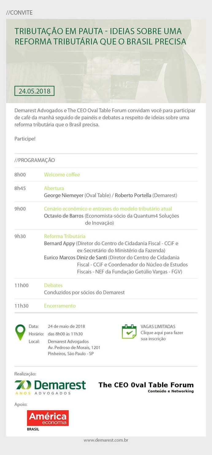 Dia 24/5, em SP, o escritório Demarest Advogados, em parceria com o The CEO Oval Table Forum, reúne especialistas para debater a "Reforma Tributária". O economista Octavio de Barros fala do cenário atual e os entraves do modelo tributário. Ex-secretário do Ministério da Fazenda, Bernard Appy participa no painel sobre a reforma. E na última parte do evento, os sócios da banca conduzem um debate sobre as ideias apresentadas com todos os convidados e a plateia. (Clique aqui)