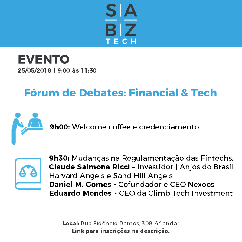 Escritório SABZ Advogados realiza, dia 25/5, em SP, o "Fórum de Debates: Financial & Tech" (clique aqui). Inscrições, clique aqui.