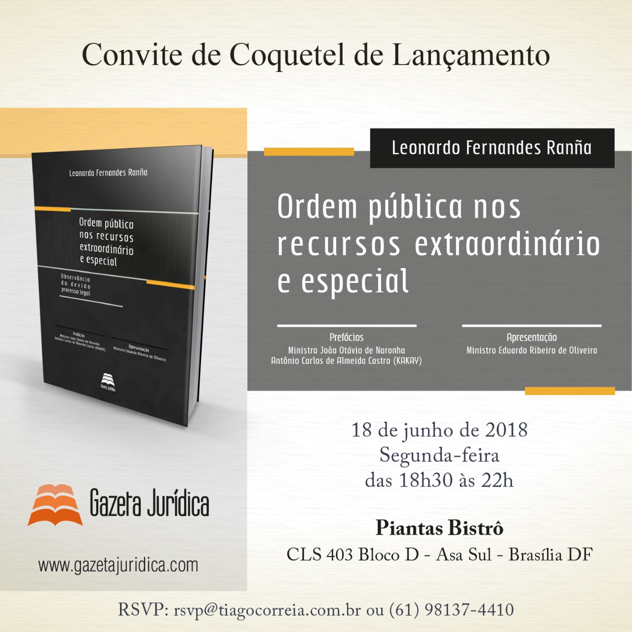 No próximo dia 18 será lançado o título "Ordem Pública nos Recursos Extraordinário e Especial" (Gazeta Jurídica), de Leonardo Fernandes Ranña. O evento será em Brasília, no Piantas Bistrô, das 18h30 às 22h. (Clique aqui)
