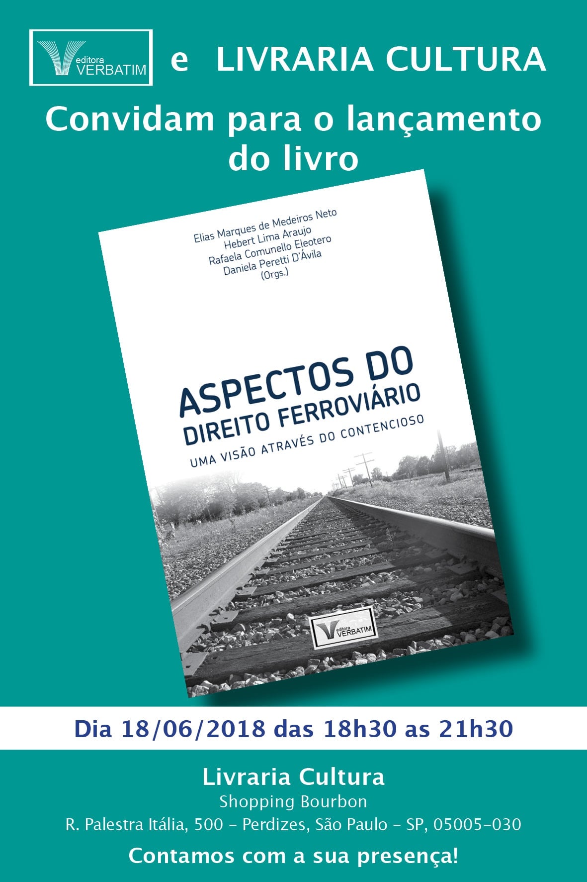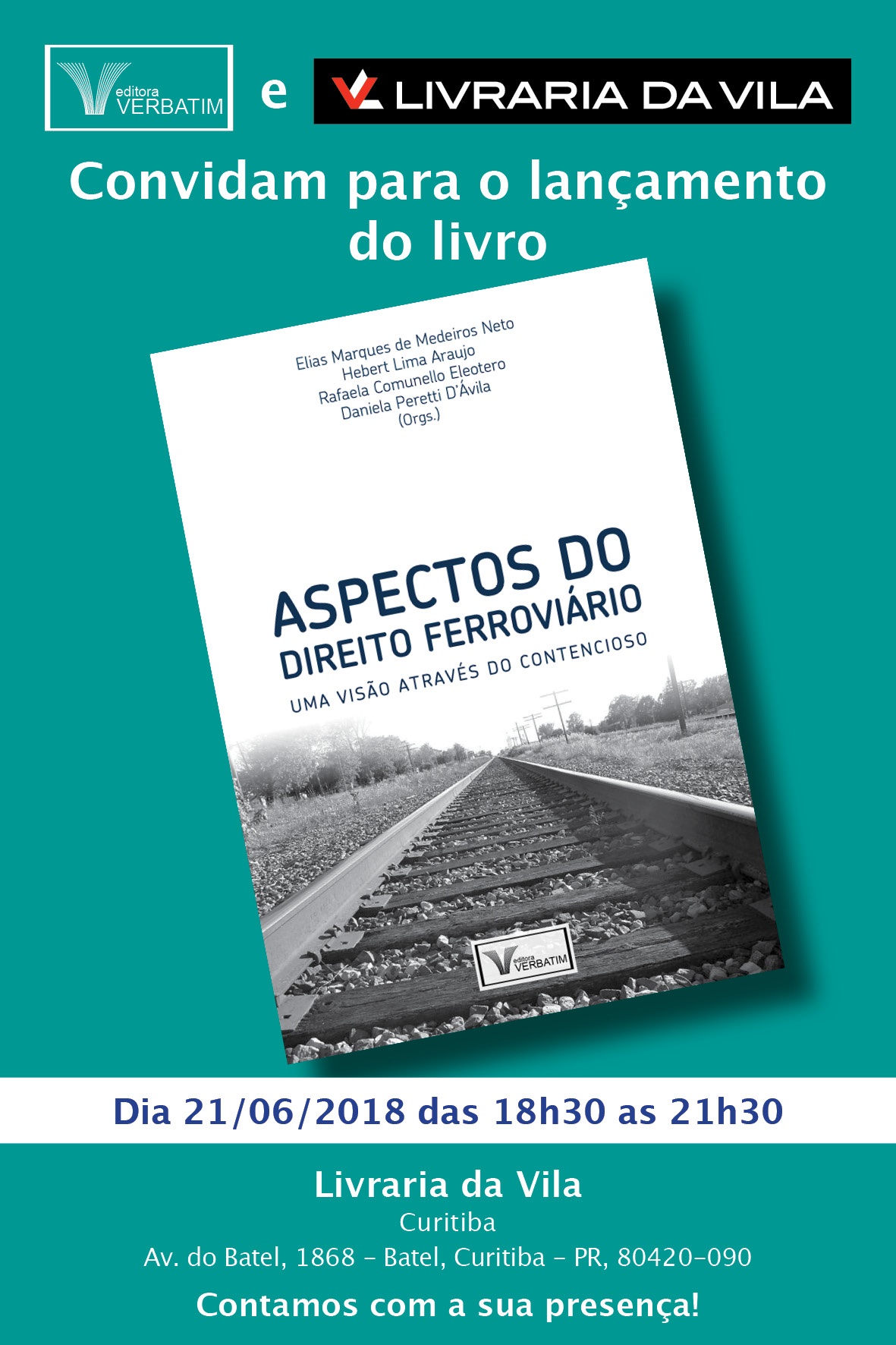 Acontece, no próximo dia 18, o lançamento da obra "Aspectos do Direito Ferroviário: Uma visão através do contencioso" (Verbatim), organizada por Elias Marques de Medeiros Neto, diretor jurídico da Cosan, Hebert Lima Araujo, Rafaela Comunello Eleotero e Daniela Peretti D'Ávila. O evento será em SP, na Livraria Cultura do Shopping Bourbon, das 18h30 às 21h30 (clique aqui). Já no dia 21, o lançamento será em Curitiba/PR, na Livraria da Vila, das 18h30 às 21h30. (Clique aqui)