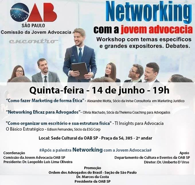 No próximo dia 14, a sócia da Thelema Coaching para Advogados, Maria Olívia Machado, proferirá a palestra "Networking eficaz para advogados", em workshop da OAB/SP. O evento será na sede cultural da OAB, às 19h. (Clique aqui)