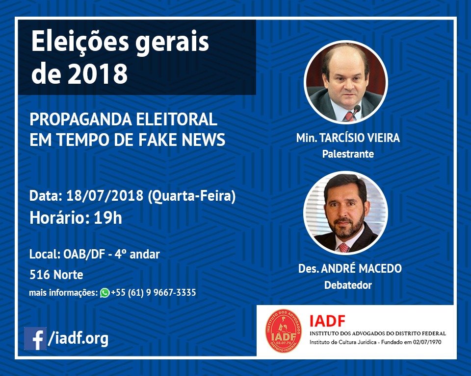 Dia 18/7, ministro Tarcísio Vieira, do TSE, será palestrante no evento "Propaganda eleitoral em tempo de Fake News", na OAB/DF, às 19h. (Clique aqui)