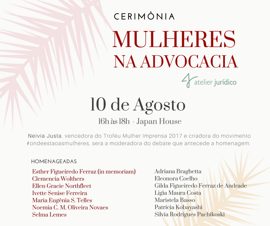 Acontece amanhã, em SP, a cerimônia "Mulheres na Advocacia", que homenageará grandes nomes do Direito pátrio, como a ministra aposentada Ellen Gracie, a advogada Maria Eugenia Raposo da Silva Telles e a professora da USP Maristela Basso. A cerimônia será na Japan House, das 16h às 18h. (Clique aqui)