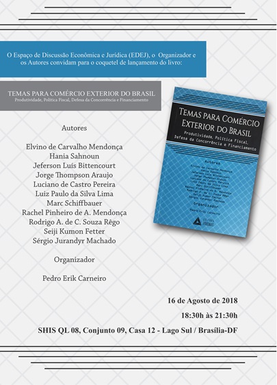 No próximo dia 16, será lançada a obra coletiva "Temas para Comércio Exterior do Brasil", organizada por Pedro Erik Carneiro e com a coautoria de renomados autores de peso. O evento será em Brasília, das 18h30 às 21h30. (Clique aqui)