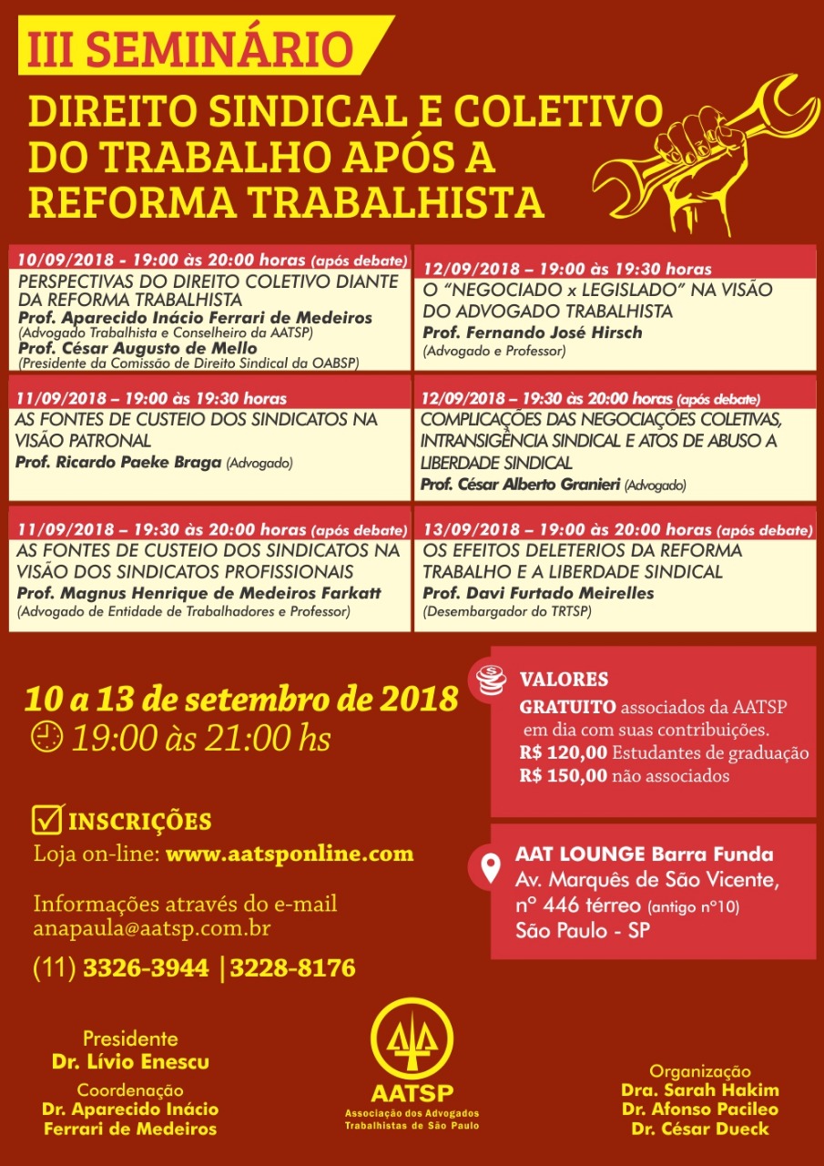 De 10 a 13/9, em SP, acontece o "III Seminário Direito Sindical e Coletivo do Trabalho após a Reforma Trabalhista". No dia 10/9, Aparecido Inácio Ferrari de Medeiros (Aparecido Inácio e Pereira Advogados Associados), que é o coordenador do evento, apresenta a palestra "Perspectivas do Direito Coletivo Diante da Reforma Trabalhista". (Clique aqui)