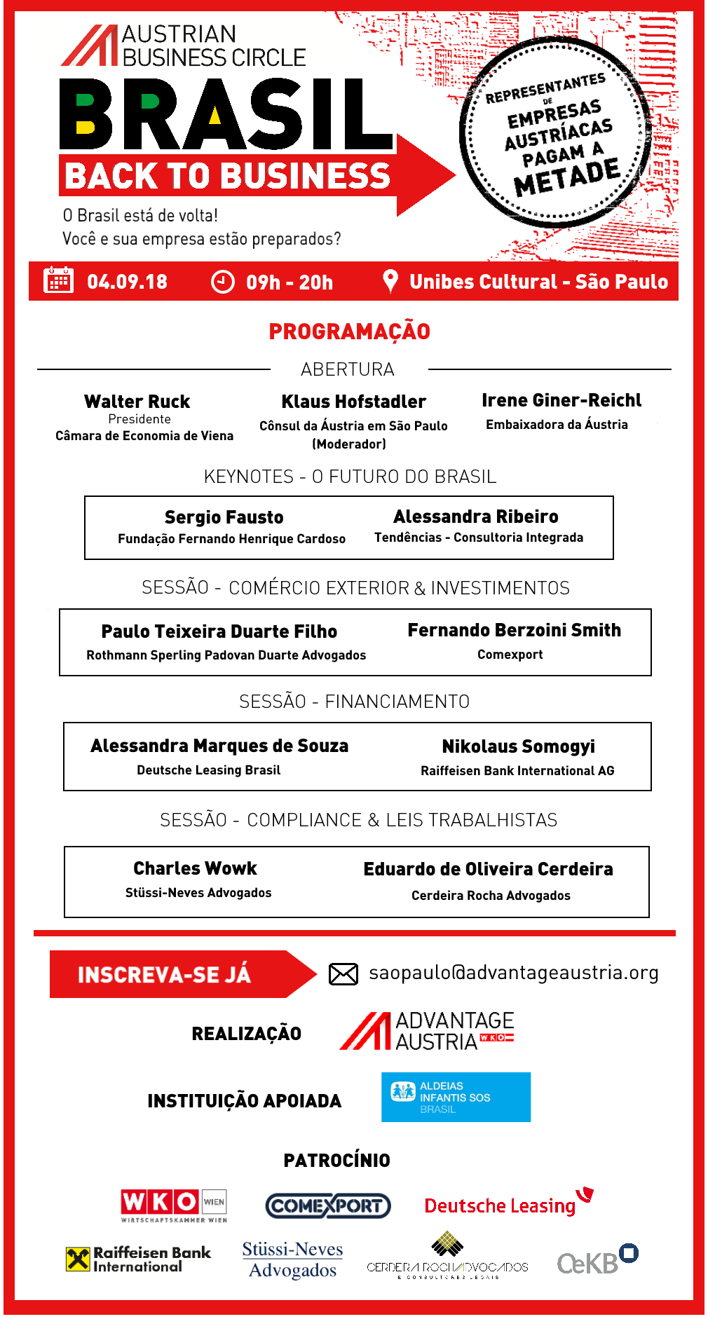 Em SP, dia 4/9, acontece o "Brasil: Back to Business", evento organizado pela Advantage Austria, Departamento Comercial do Consulado Geral da Áustria. Eduardo de Oliveira Cerdeira, do escritório Cerdeira Rocha Advogados e Consultores Legais, será um dos palestrantes da sessão "Compliance & Legislação Trabalhista: Temas que você não pode mais adiar". (Clique aqui)