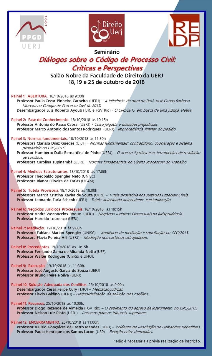 Dias 18, 19 e 25/10, no RJ, acontece o seminário "Diálogos sobre o Código de Processo Civil: Críticas e Perspectivas". Entre os palestrantes, estão, Andre Vasconcelos Roque (Gustavo Tepedino Advogados), Bruno Freire e Silva (Bruno Freire Advogados), Flávio Galdino e Diogo Rezende de Almeida (ambos do Galdino & Coelho Advogados) e Paulo Henrique dos Santos Lucon (Lucon Advogados). (Clique aqui)