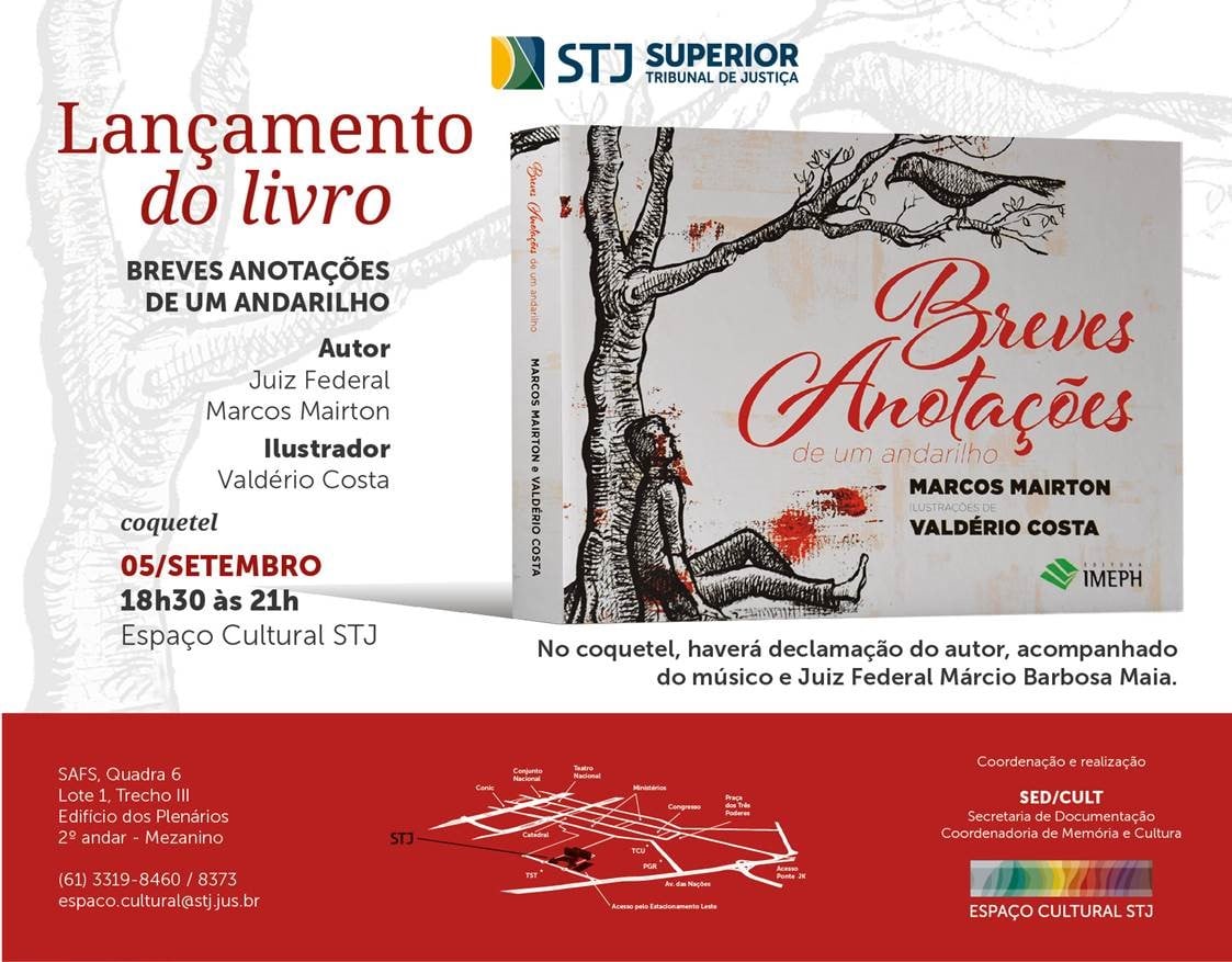 No próximo dia 5 será lançado o livro "Breves Anotações de um Andarilho", do juiz Federal Marcos Mairton. O evento será em Brasília, no Espaço Cultural STJ, das 18h30 às 21h. (Clique aqui)