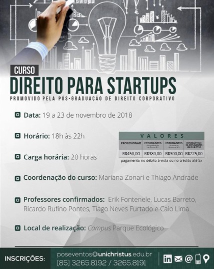 Mariana Zonari, do escritório Albuquerque Pinto Advogados, é uma das coordenadoras do curso "Direito para Startups", promovido pela pós-graduação de Direito Corporativo da UniChristus, em Fortaleza, de 19 a 23/11. Tiago Furtado, também da banca, é um dos professores do curso. (Clique aqui)