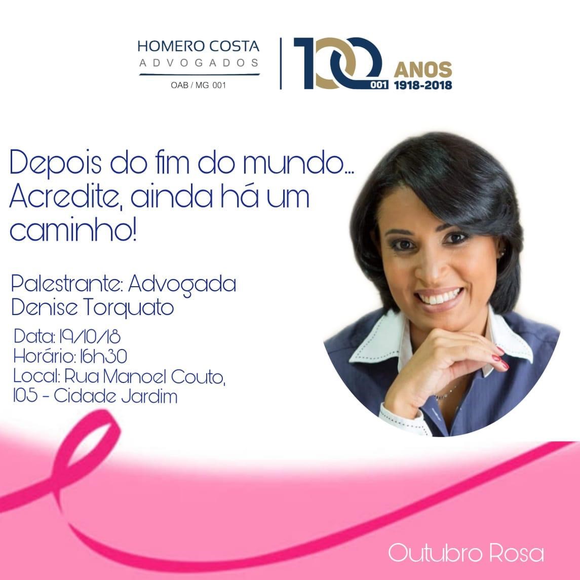 O Outubro Rosa é o mês de conscientização para a prevenção do Câncer de Mama. E, neste mês, Homero Costa Advogados irá receber a advogada Denise Torquato, com a palestra "Depois do fim do mundo... Acredite, ainda há uma esperança!". A palestra é sobre relatos pessoais da palestrante que passou pela experiência do câncer de mama. O evento acontece na sede do escritório, em BH/MG, dia 19/10. (Clique aqui)
