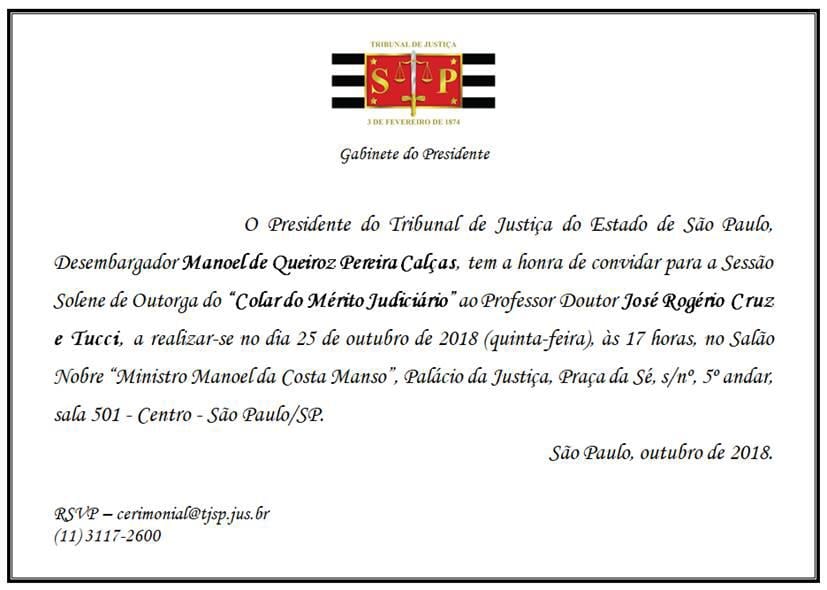 Desembargador Manoel de Queiroz Pereira Calças, presidente do TJ/SP, convida para a Sessão Solene de Outorga do "Colar do Mérito Judiciário" ao professor José Rogério Cruz e Tucci. Dia 25/10, às 17h, em SP. (Clique aqui)
