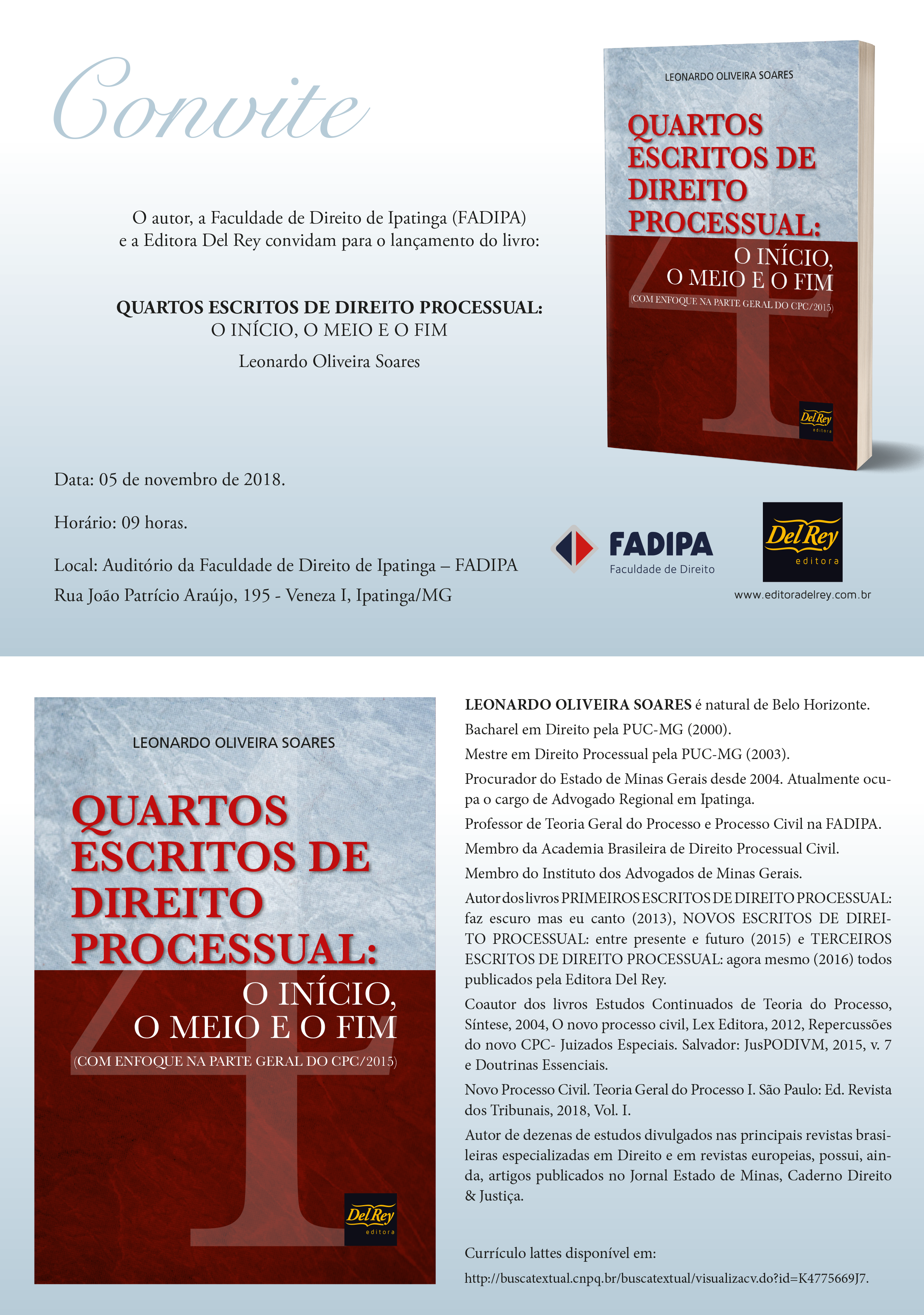 Dia 5/11, a partir de 9h, em Ipatinga/MG, acontece a manhã de autógrafos do livro da Editora Del Rey "Quartos escritos de direito processual: o Início, o Meio e o Fim", de autoria de Leonardo Oliveira Soares. (Clique aqui)