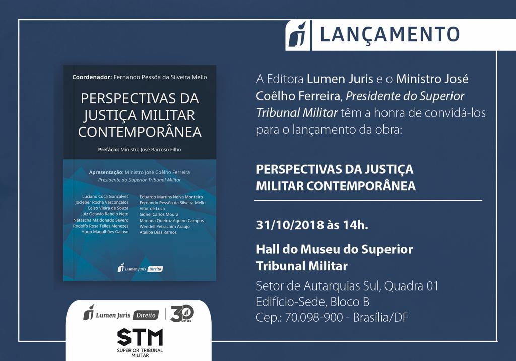 Será lançada amanhã a obra "Perspectivas da Justiça Militar Contemporânea" (Lumen Juris), coordenada por Fernando Pessôa da Silveira Mello e com a apresentação do presidente do STM, ministro José Coêlho Ferreira. O evento será em Brasília, no Museu do STM, às 14h. (Clique aqui)