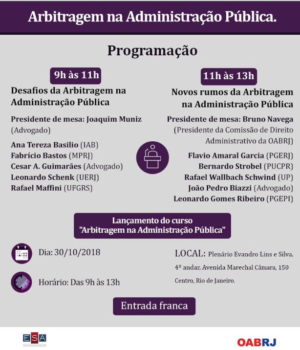 Hoje, na OAB/RJ, acontece o lançamento do curso "Arbitragem na Administração Pública". Joaquim Muniz, do escritório Trench Rossi Watanabe, é o presidente de mesa do painel "Desafios da Arbitragem na Administração Pública". (Clique aqui)