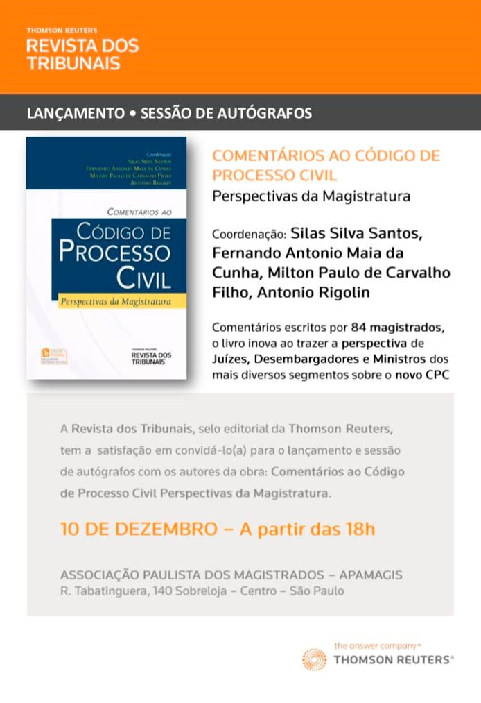 Acontece, no próximo dia 10, o lançamento do livro "Comentários ao Código de Processo Civil - Perspectivas da Magistratura" (Thomson Reuters - Revista dos Tribunais), coordenado por Silas Silva Santos, Fernando Antonio Maia da Cunha, Milton Paulo de Carvalho Filho e Antonio Rigolin; com a coautoria de Ronaldo Alves de Andrade, do HSLAW. O evento será em SP, na APAMAGIS, a partir das 18h. (Clique aqui)