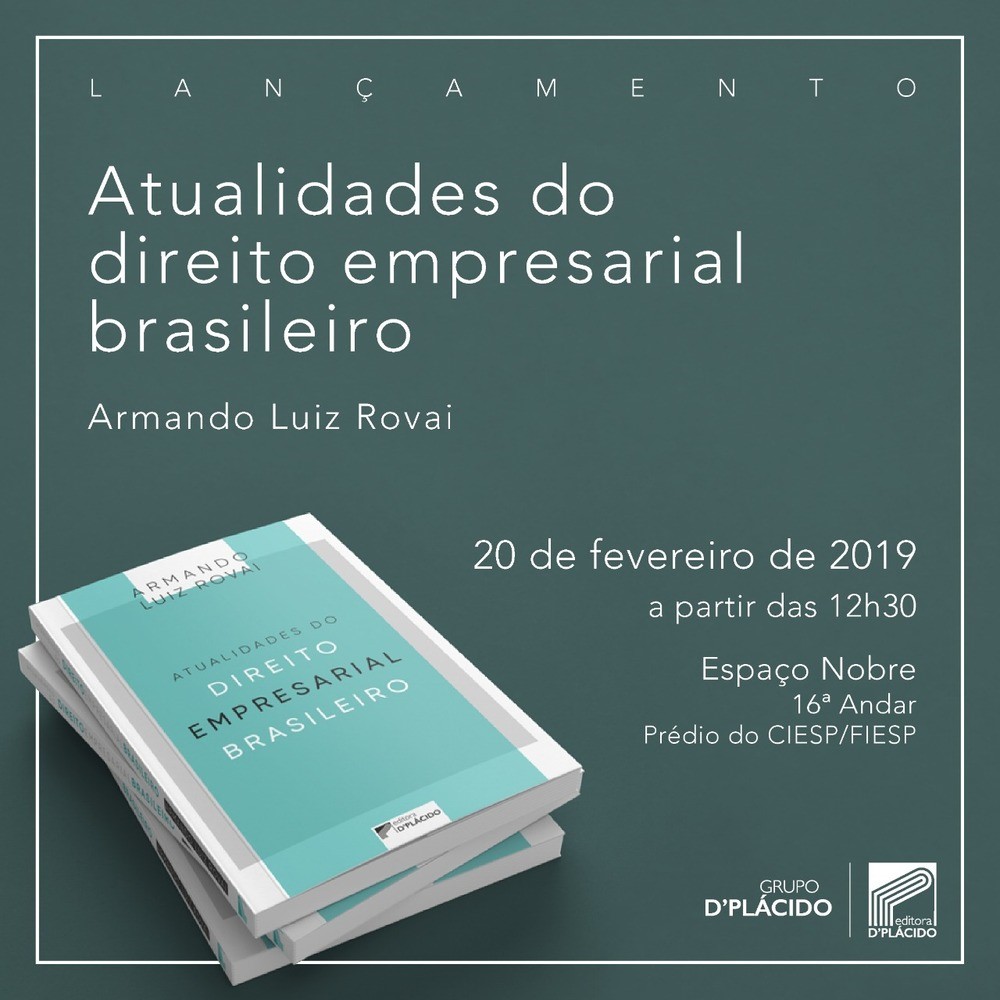 Será lançado, no próximo dia 20, o livro "Atualidades do Direito Empresarial Brasileiro" (D'Plácido), de Armando Luiz Rovai. O evento será em SP, no Espaço Nobre da CIESP/FIESP (av. Paulista, 1.313, 16º andar), a partir das 12h30. (Clique aqui)