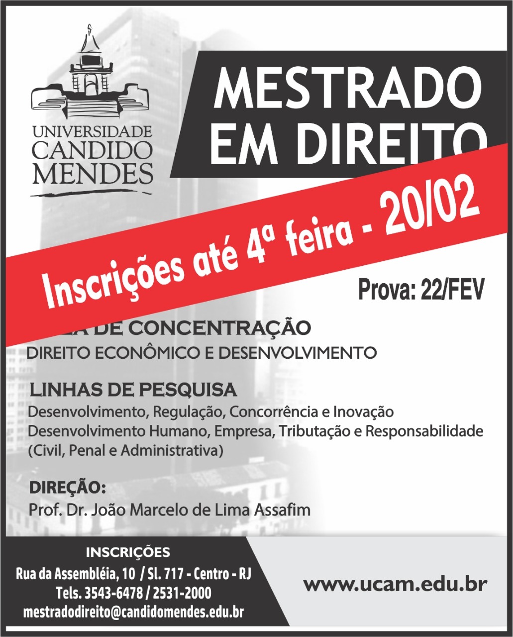 O prazo para inscrição no processo seletivo do "Mestrado em Direito Econômico e Desenvolvimento", da Universidade Candido Mendes - UCAM, no RJ, sob direção do professor João Marcelo de Lima Assafim (De Lima Assafim e Advogados Associados), termina amanhã. O curso destina-se a quem quer efetivar novas práticas e ampliar o seu conhecimento nas questões técnicas interdisciplinares que impulsionam e protegem a inovação e permeiam o desenvolvimento. (Clique aqui)