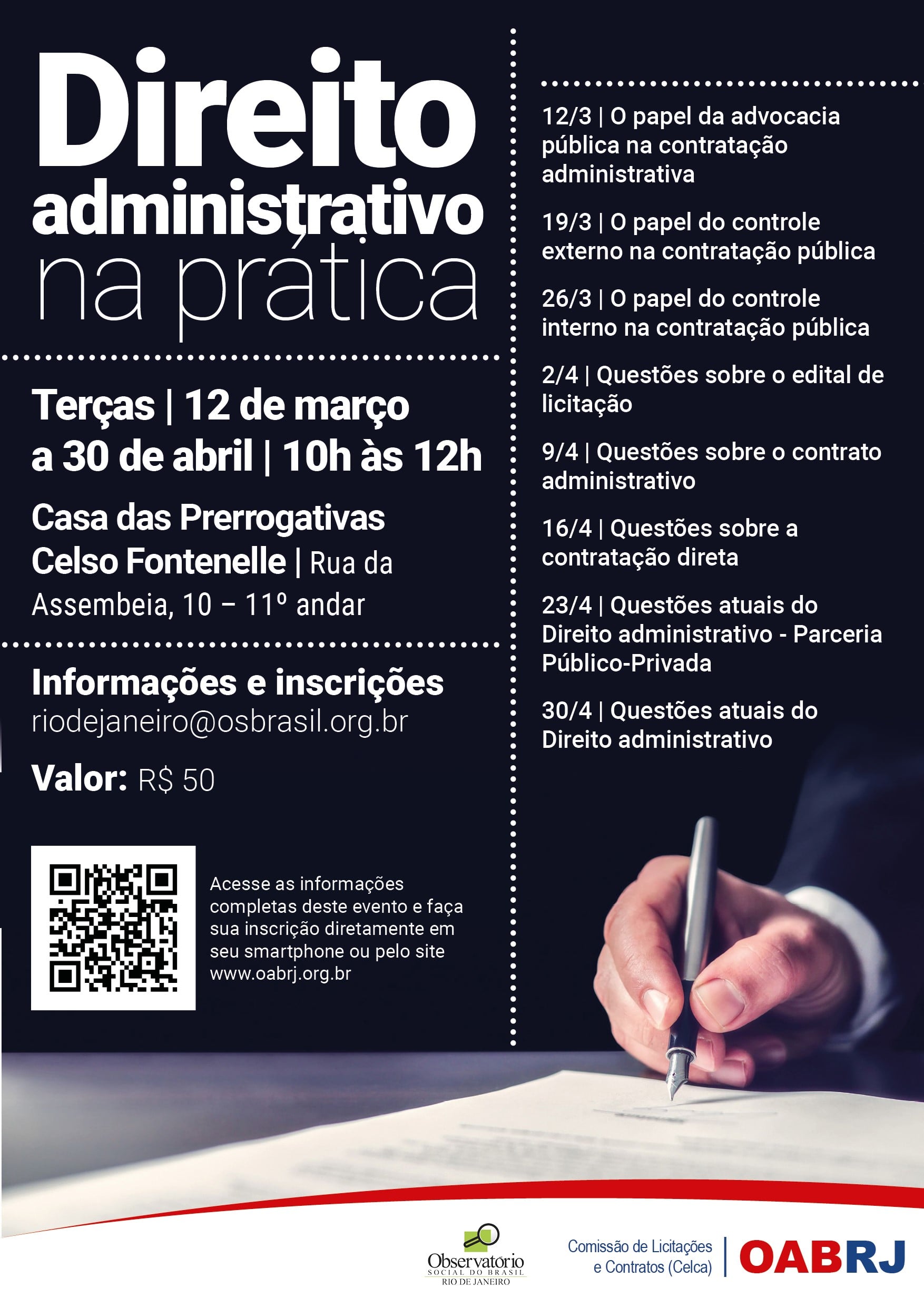 Paula Pincelli Tavares Vivacqua (Vivacqua Advogados), na condição de presidente da CELCA - Comissão de Licitações e Contratos da OAB/RJ, promove, em parceria com o Observatório Social do Rio, o curso "Direito Administrativo na prática", de 12/3 a 30/4, às terças-feiras, no RJ. (Clique aqui)