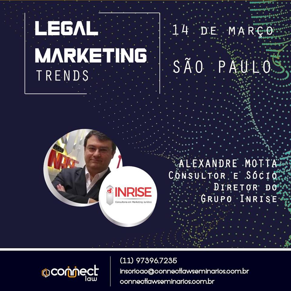 Amanhã acontece a palestra do consultor do Grupo Inrise, Alexandre Motta, no evento "Legal Marketing Trends", um dos maiores eventos de Marketing Jurídico do Brasil. Convidados do Grupo Inrise tem 20% de desconto. Não perca! (Clique aqui)
