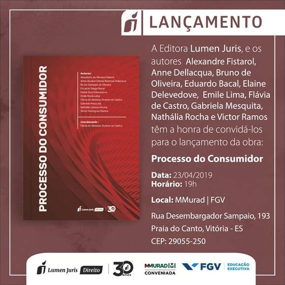 Será lançado no próximo dia 23 o título "Processo do Consumidor" (Lumen Juris), coordenado pela juíza de Direito Flávia A. V. Castro. O evento será em Vitória/ES, na MMurad/FGV, às 19h. (Clique aqui)