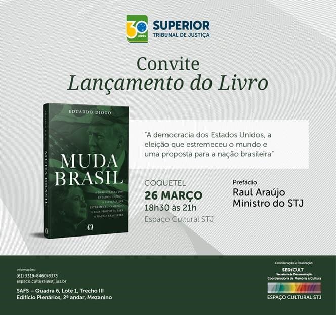Acontece, no próximo dia 26, o lançamento do livro "Muda Brasil", de Eduardo Diogo. O evento será em Brasília, no Espaço Cultural STJ, das 18h30 às 21h. (Clique aqui)