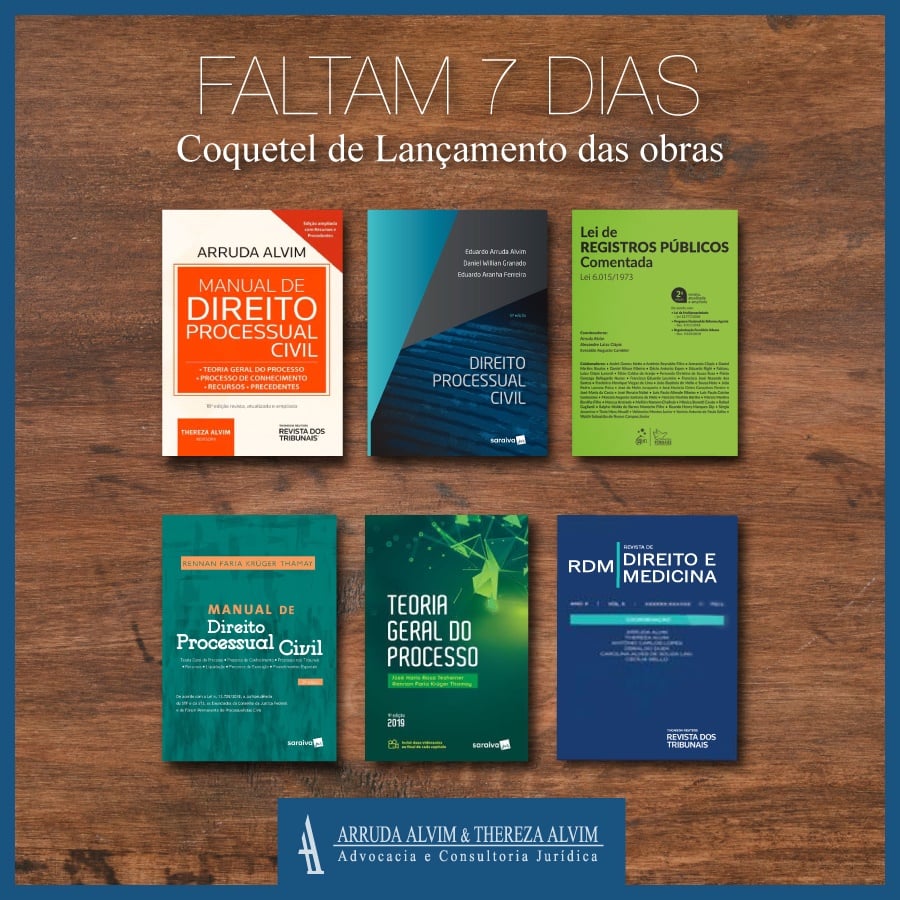 O escritório Arruda Alvim e Thereza Alvim Advocacia e Consultoria Jurídica lança, no próximo dia 3, as obras: "Manual de Direito Processual Civil" (18ª edição), "Direito Processual Civil" (6ª edição), "Manual de Direito Processual Civil" (2ª edição), "Teoria Geral do Processo" (4ª edição), "Lei de Registros Públicos Comentada" (2ª edição) e "RDM - Revista de Direito e Medicina". O evento será em SP, no Buffet Palace (av. Brigadeiro Faria Lima, 1.912), a partir das 19h. (Clique aqui)