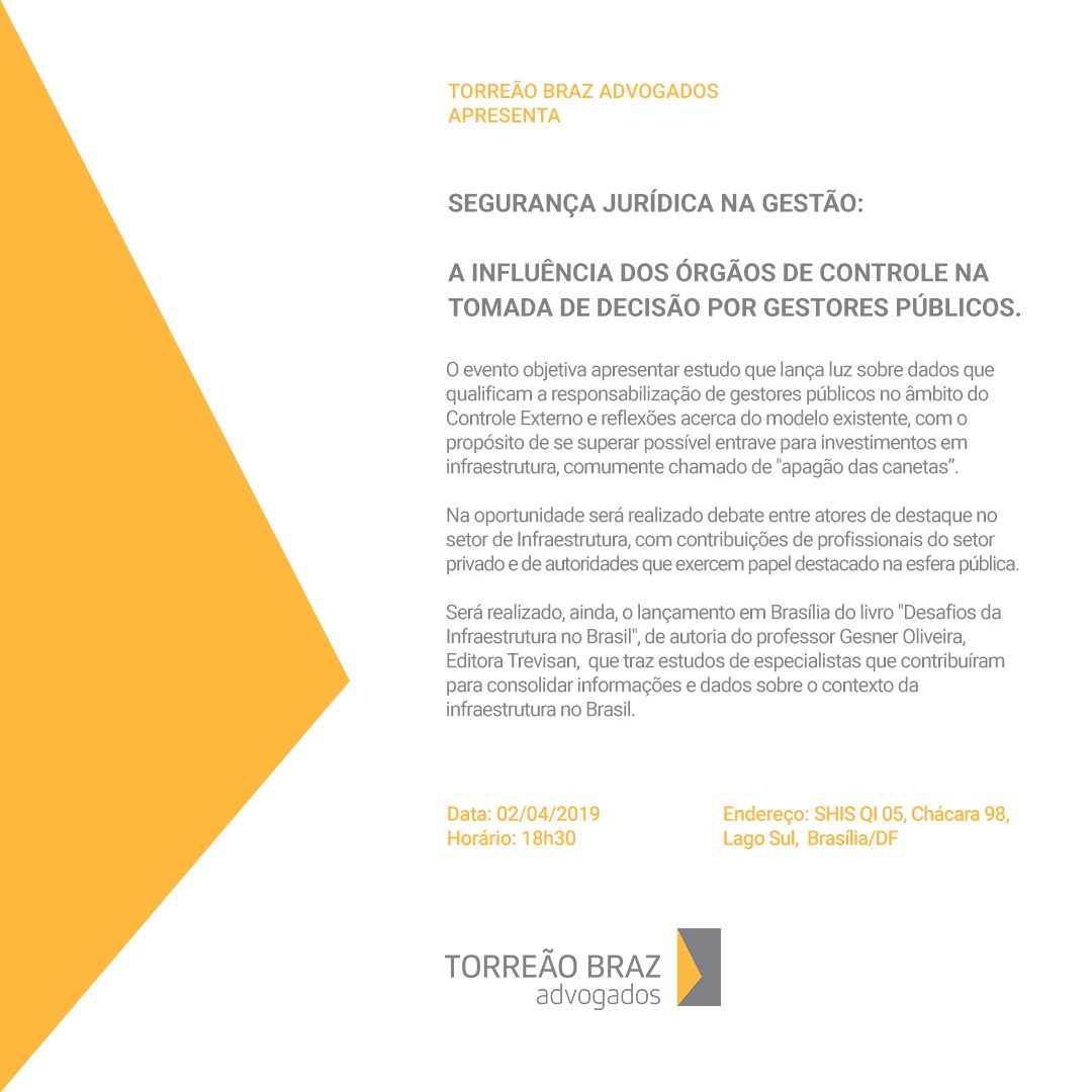 Dia 2/4, o escritório Torreão Braz Advogados realiza o evento "Segurança Jurídica na Gestão. A influência dos órgãos de controle na tomada de decisão por agentes públicos". Na ocasião será lançado estudo/relatório homônimo, proveniente de trabalho realizado por integrantes do escritório e do projeto INFRA 2038. O professor Gesner de Oliveira confirmou a presença como palestrante e aproveitará a ocasião para relançar a obra "Desafios da infraestrutura no Brasil". Além dele, serão expositores: Vinícius Carvalho (ex-presidente do Cade), Flávio Unes e José Carlos Martins (presidente da CBIC). (Clique aqui)