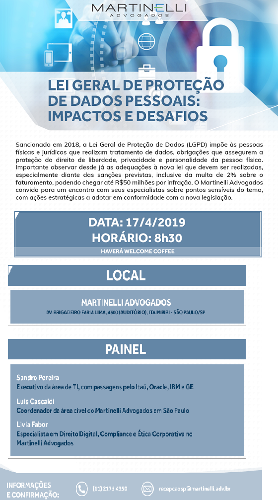 Dia 17/4, Martinelli Advogados realiza o evento "Lei Geral de Proteção de Dados Pessoais: Impactos e desafios", em SP. Especialistas do escritório falarão sobre os pontos sensíveis do tema e ações estratégicas que devem ser adotadas para estar em conformidade com a nova legislação. (Clique aqui)