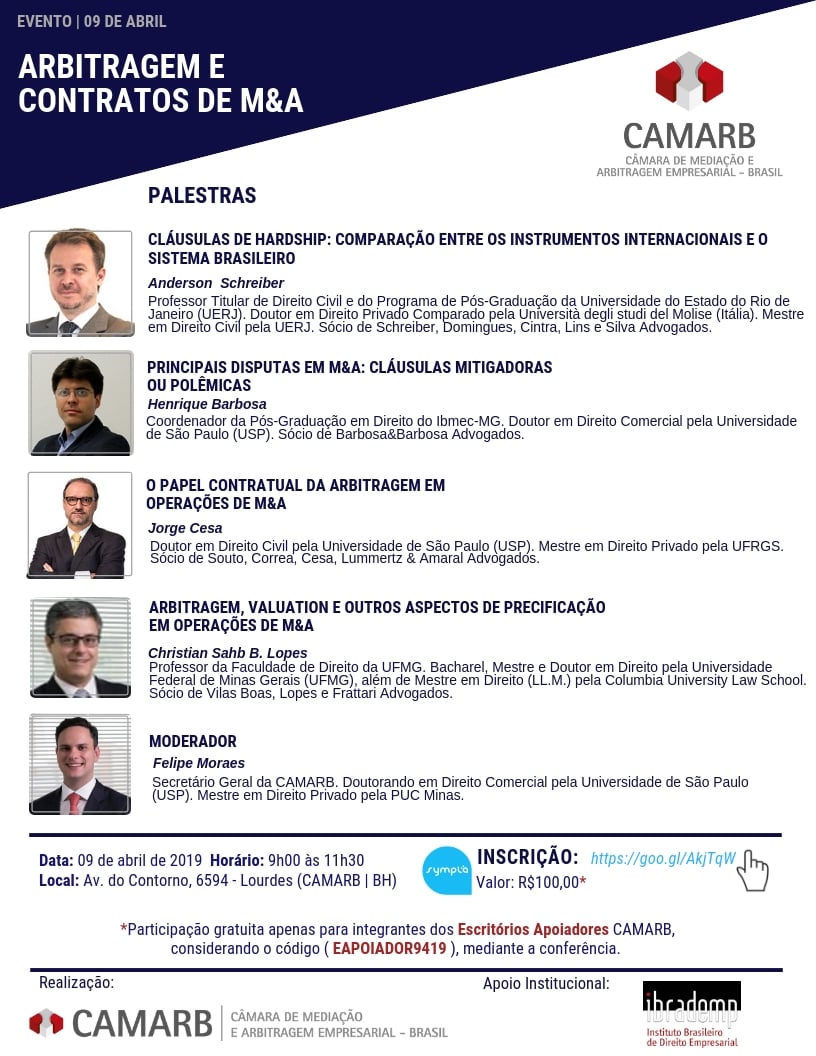 Christian Lopes, sócio do escritório Vilas Boas Lopes e Frattari Advogados, apresenta a palestra "Arbitragem, Valuation e outros Aspectos de Precificação em Operações de M&A", no evento "Arbitragem e Contratos de M&A", organizado pela CAMARB - Camara de Mediacao e Arbitragem Empresarial - Brasil. Em BH, dia 9/4. (Clique aqui)