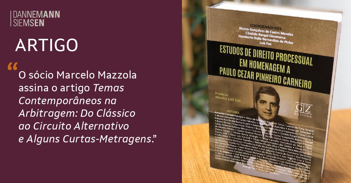 Acaba de ser lançada a obra "Estudos de Direito Processual em Homenagem a Paulo Cezar Pinheiro Carneiro" (GZ Editora), coordenada pelo desembargador Aluisio Gonçalves de Castro Mendes, Cândido Rangel Dinamarco, Humberto Dalla Bernardina de Pinho e pelo ministro Luiz Fux. O livro conta com a coautoria de Marcelo Mazzola, sócio da banca Dannemann Siemsen, que assina o artigo "Temas Contemporâneos na Arbitragem: do Clássico ao Circuito Alternativo e Alguns Curtas-Metragens". (Clique aqui)