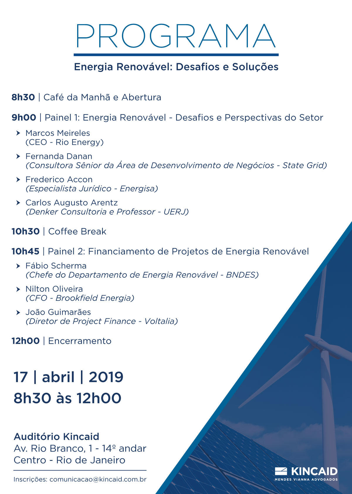 O evento "Energia Renovável: Desafios e Soluções", que acontece dia 17/4, no escritório Kincaid | Mendes Vianna Advogados, no RJ, traz gabaritados executivos do setor que debaterão os principais desafios e perspectivas do mercado. (Clique aqui)