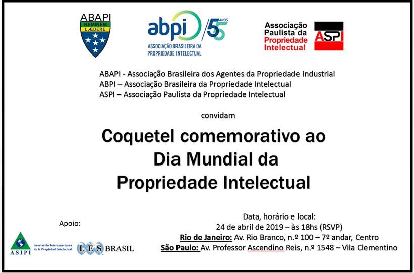 ABAPI - Associação Brasileira dos Agentes da Propriedade Industrial, ABPI - Associação Brasileira da Propriedade Intelectual e ASPI convidam para o "Coquetel Comemorativo ao Dia Mundial da Propriedade Intelectual" (clique aqui), no dia 24/4, no RJ, às 18h. Informações (clique aqui) e confirmação de presença, por e-mail.