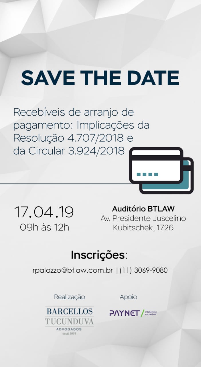 Dia 17/4, o escritório Barcellos Tucunduva Advogados realiza o evento "Recebíveis de arranjo de pagamento: implicações da Resolução 4.707/2018 e da Circular 3.924/2018". (Clique aqui)
