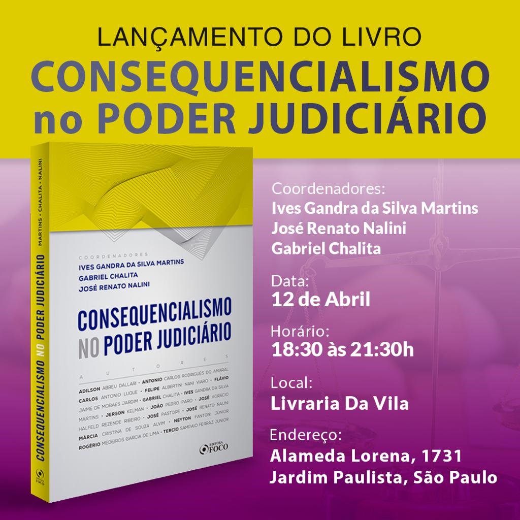 Acontece, hoje, o lançamento do livro "Consequencialismo no Poder Judiciário" (Foco), coordenado por Ives Gandra da Silva Martins, da Advocacia Gandra Martins, José Renato Nalini e Gabriel Chalita. O evento será em SP, na Livraria da Vila, das 18h30 às 21h30. (Clique aqui)