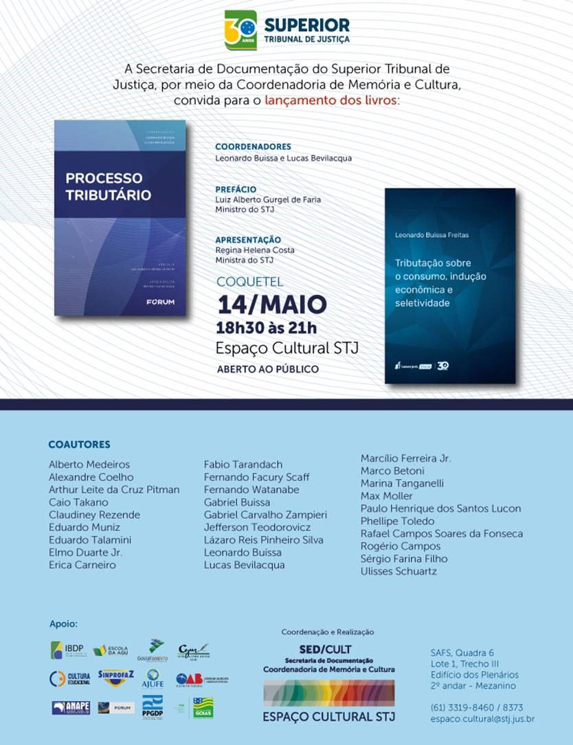 Serão lançados no próximo dia 14 os livros "Processo Tributário" e "Tributação sobre o Consumo, Indução Econômica e Seletividade". O evento será em Brasília, no Espaço Cultural STJ, das 18h30 às 21h. (Clique aqui)