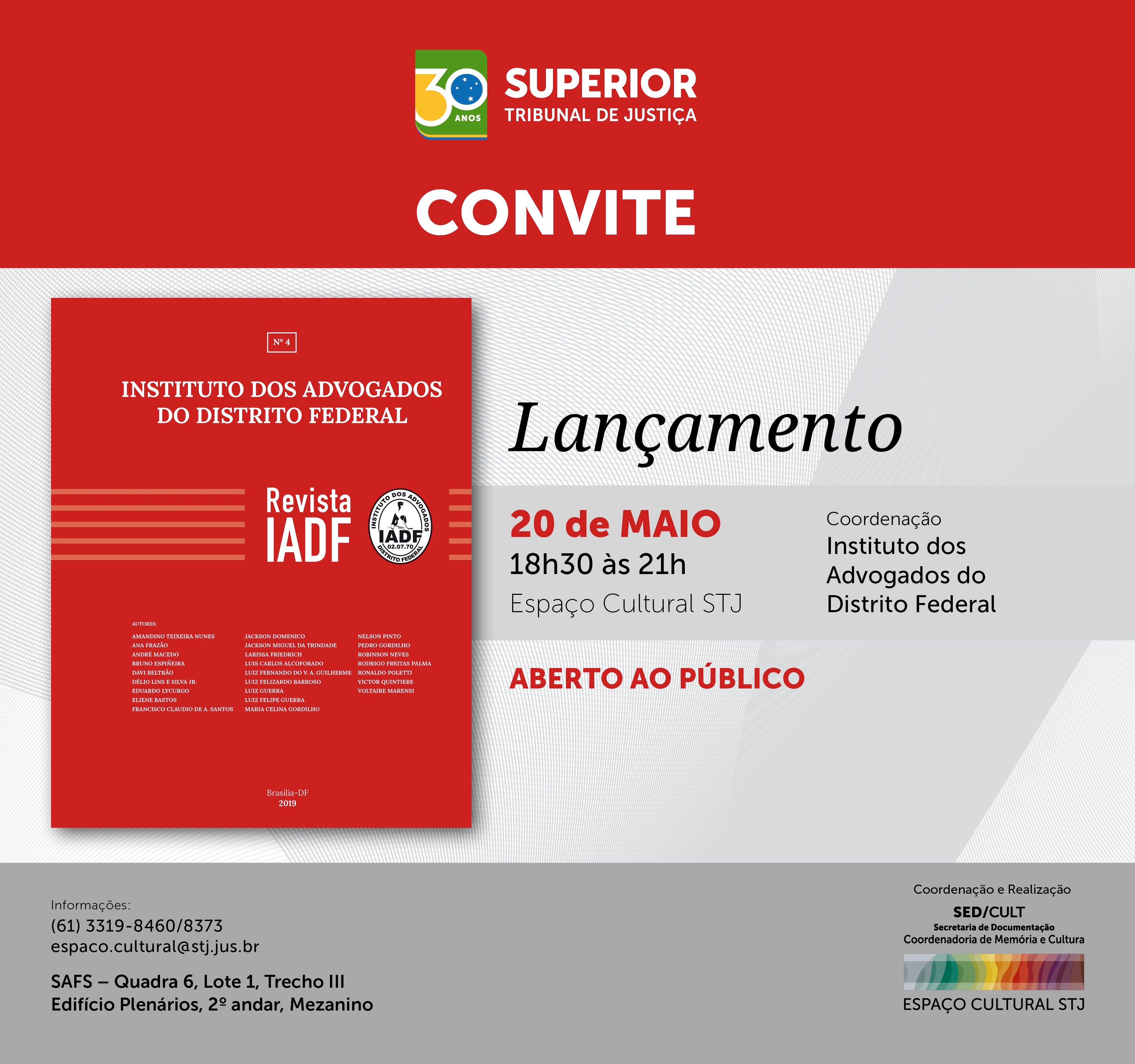 Criada em 1971, pelo então presidente Roberto Rosas (Rosas Advogados), a "Revista IADF" será lançada no dia 20/5. A publicação é uma verdadeira obra de consulta para a comunidade jurídica com mais de 370 páginas, escrita por renomados juristas e advogados, entre eles Luiz Fernando do Vale de Almeida Guilherme, que será representado no lançamento pela advogada Zanaliz Costa, ambos do escritório Almeida Guilherme Advogados Associados. O evento será no Espaço Cultural STJ, das 18h30 às 21h. (Clique aqui)