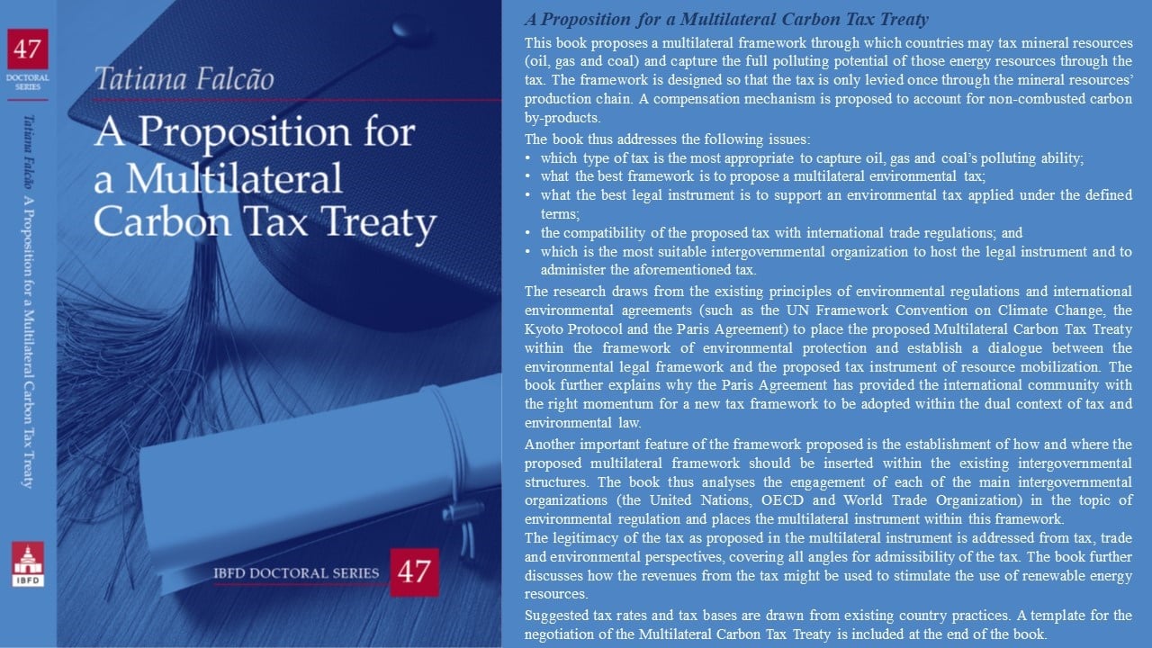 Acaba de ser lançado o livro "A Proposition for a Multilateral Carbon Tax Treaty", de Tatiana Falcão, pelo International Bureau of Fiscal Documentation (IBFD), um thin tank especializado em Direito Tributário Internacional. (Clique aqui)