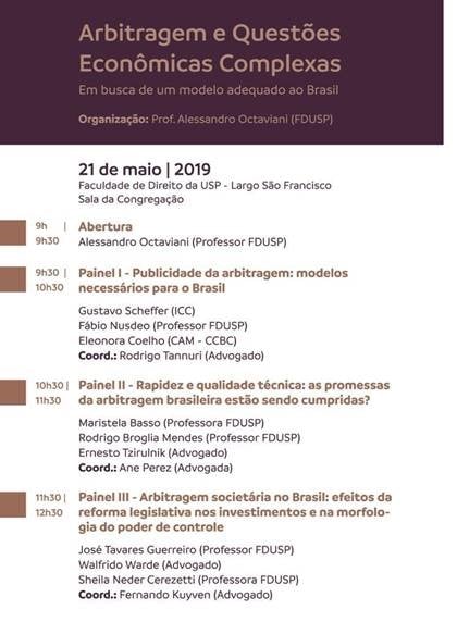 Dia 21/5, a Faculdade de Direito da USP promove o debate "Arbitragem e Questões Econômicas Complexas - Em busca de um modelo adequado ao Brasil". Participam do evento: Alessandro Octaviani, Gustavo Scheffer, Fábio Nusdeo, Eleonora Coelho (presidente do Centro de Arbitragem e Mediação da Câmara de Comércio Brasil-Canadá), Rodrigo Tannuri, Maristela Basso, Rodrigo Broglia Mendes, Ernesto Tzirulnik, Ane Perez, José Tavares Guerreiro, Walfrido Warde (Warde Advogados), Sheila Neder Cerezetti e Fernando Kuyven. (Clique aqui)