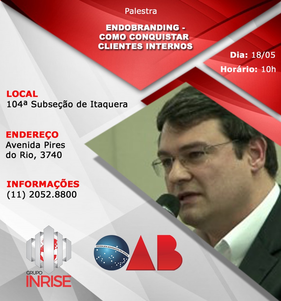 Dia 18/5, o consultor e sócio-diretor do Grupo Inrise, Alexandre Motta, faz palestra, em SP, às 10h, sobre "Endobranding - Como conquistar clientes internos". (Clique aqui)