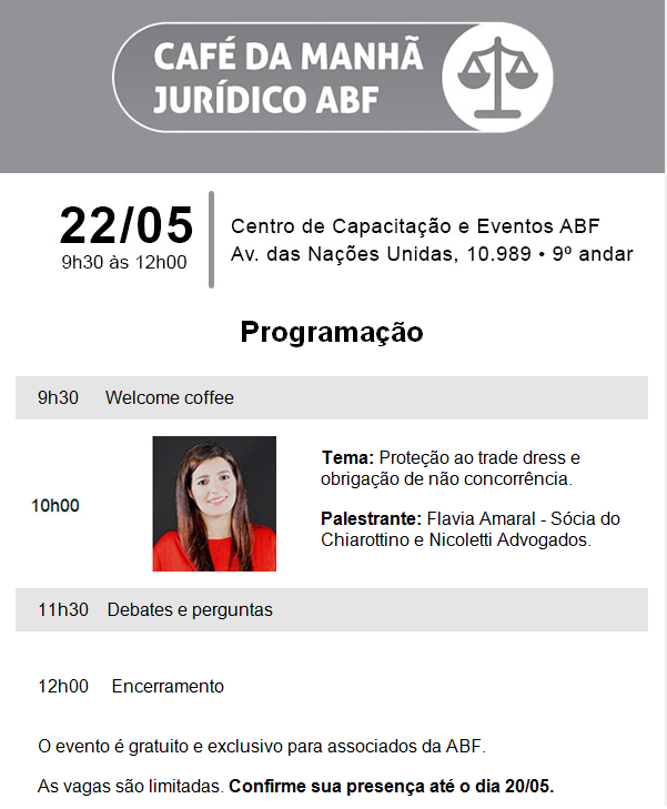 Em café da manhã a ser promovido pela ABF - Associação Brasileira de Franchising, a sócia do escritório Chiarottino e Nicoletti - Advogados, Flávia Amaral, palestrará a respeito da proteção ao trade dress e a obrigação de não concorrência no mercado do país. O evento ocorre dia 22/5, às 9h30, em SP. (Clique aqui)