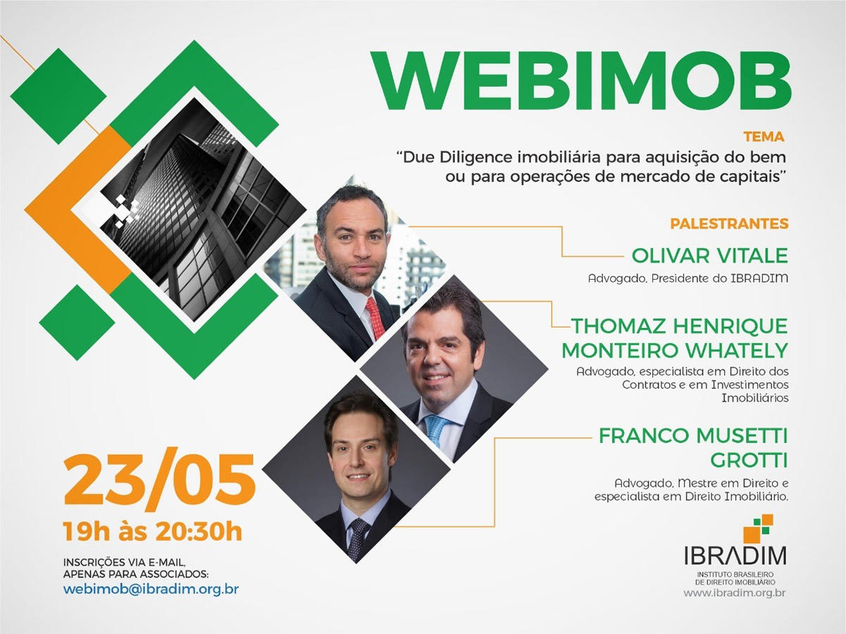Dia 23/5, Thomaz Henrique Monteiro Whately, sócio da banca Huck Otranto Camargo, participa como palestrante do "WEBMOBI", com o tema "Due Diligence imobiliária para aquisição do bem ou para operações de mercado de capitais". (Clique aqui)
