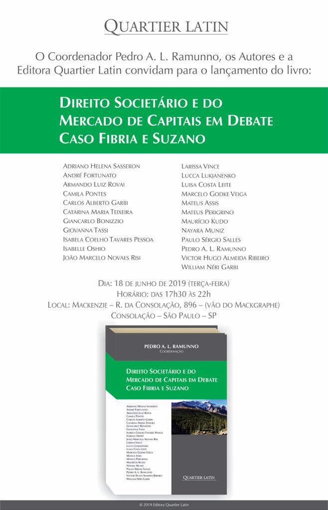 Acontece, no próximo dia 18, o lançamento do livro "Direito Societário e do Mercado de Capitais em Debate - Caso Fibria e Suzano", coordenado por Pedro A. L. Ramunno, e com a coautoria de William Néri Garbi e Carlos Alberto Garbi, do escritório Garbi Sociedade de Advogados. O evento será em SP, no Mackenzie, das 17h30 às 22h. (Clique aqui)