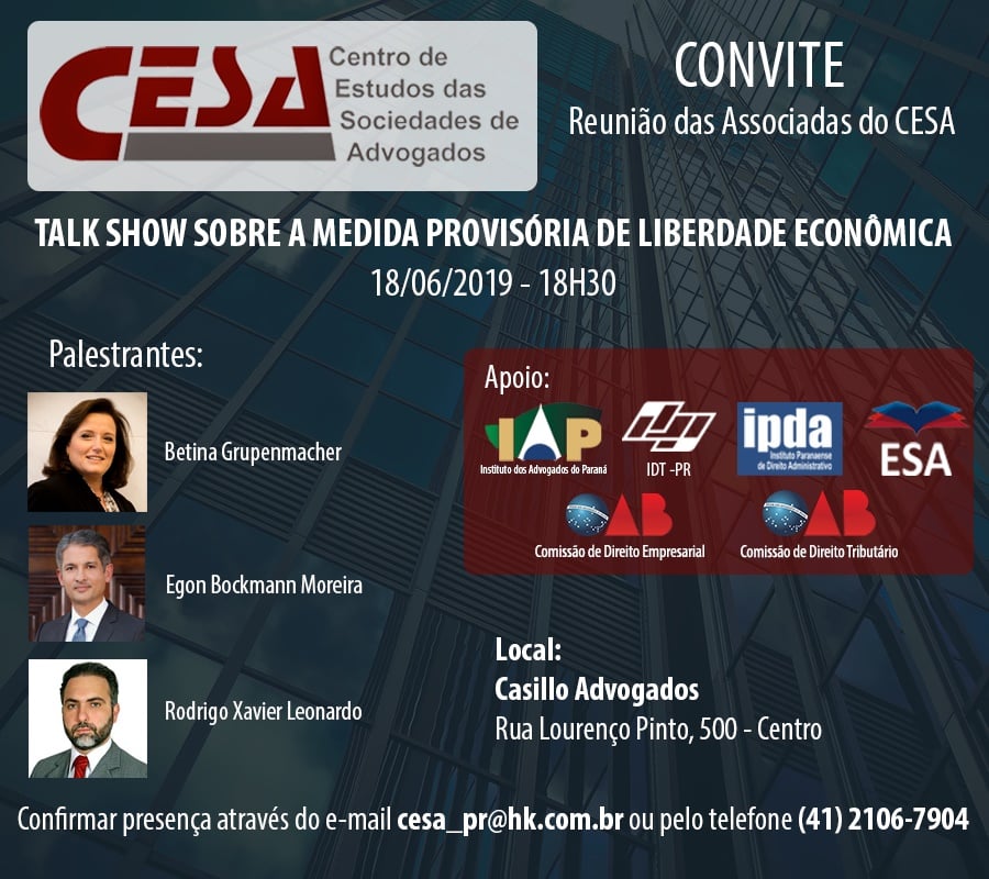 CESA - Centro de Estudos das Sociedades de Advogados promove, dia 18/6, em Curitiba/PR, o "Talk Show sobre a Medida Provisória de Liberdade Econômica" (clique aqui). Inscrições gratuitas pelo e-mail (clique aqui) ou pelo telefone (41) 2106-7904.