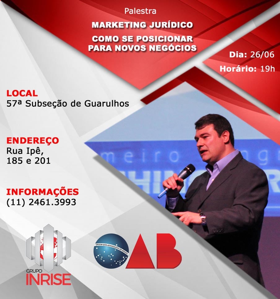 Dia 26/6, o consultor e sócio-diretor do Grupo Inrise, Alexandre Motta, faz palestra em Guarulhos/SP, às 19h, sobre "Marketing Jurídico - Como se posicionar para novos negócios". (Clique aqui)
