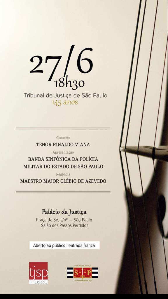 Dia 27/6, às 18h30, no Palácio da Justiça de SP, em homenagem aos 145 anos da Corte Paulista, ocorrerá concerto com o tenor Rinaldo Viana e a Banda Sinfônica da PM/SP, sob a regência do maestro major Clébio de Azevedo. O evento é gratuito e aberto ao público. (Clique aqui)