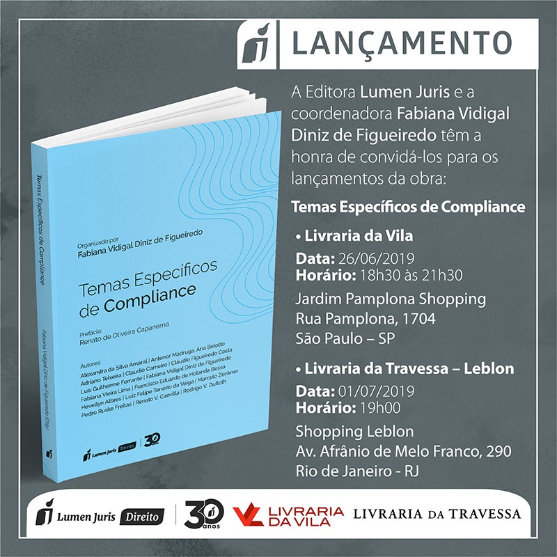 Será lançado hoje o livro "Temas Específicos de Compliance", organizado pela advogada Fabiana Vidigal de Figueiredo. O evento será em SP, na Livraria da Vila, das 18h30 às 21h30. (Clique aqui)