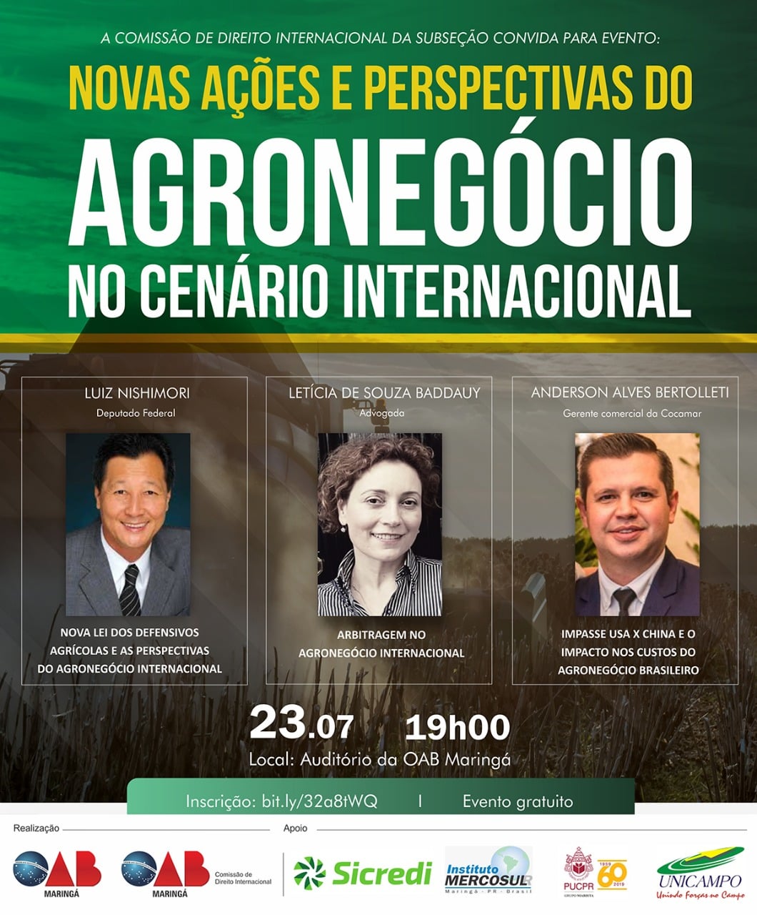 Dia 23/7, às 19h, Letícia S. Baddauy, do escritório L. Baddauy Advocacia, participa em Maringá/PR do evento "Novas ações e perspectivas do Agronegócio no cenário internacional", promovido pela Comissão de Direito Internacional da OAB/Maringá. No encontro, a advogada apresenta palestra sobre "Arbitragem no Agronegócio Internacional". (Clique aqui)
