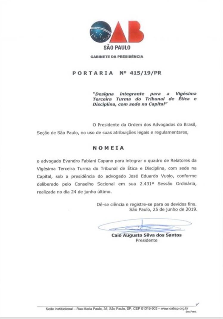 O jurista e advogado Evandro Fabiani Capano, sócio fundador da banca Capano, Passafaro Advogados Associados, foi nomeado para integrar o quadro de relatores da "Vigésima Terceira Turma do Tribunal de Ética e Disciplina" da OAB/SP. (Clique aqui)