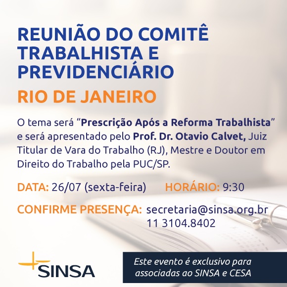Dia 26/7, às 9h30, no RJ, acontece a "Reunião do Comitê Trabalhista e Previdenciário", do CESA - Centro de Estudos das Sociedades de Advogados e do SINSA - Sindicato das Sociedades de Advogados dos Estados de São Paulo e Rio de Janeiro. O tema será "Prescrição após a Reforma Trabalhista". (Clique aqui)